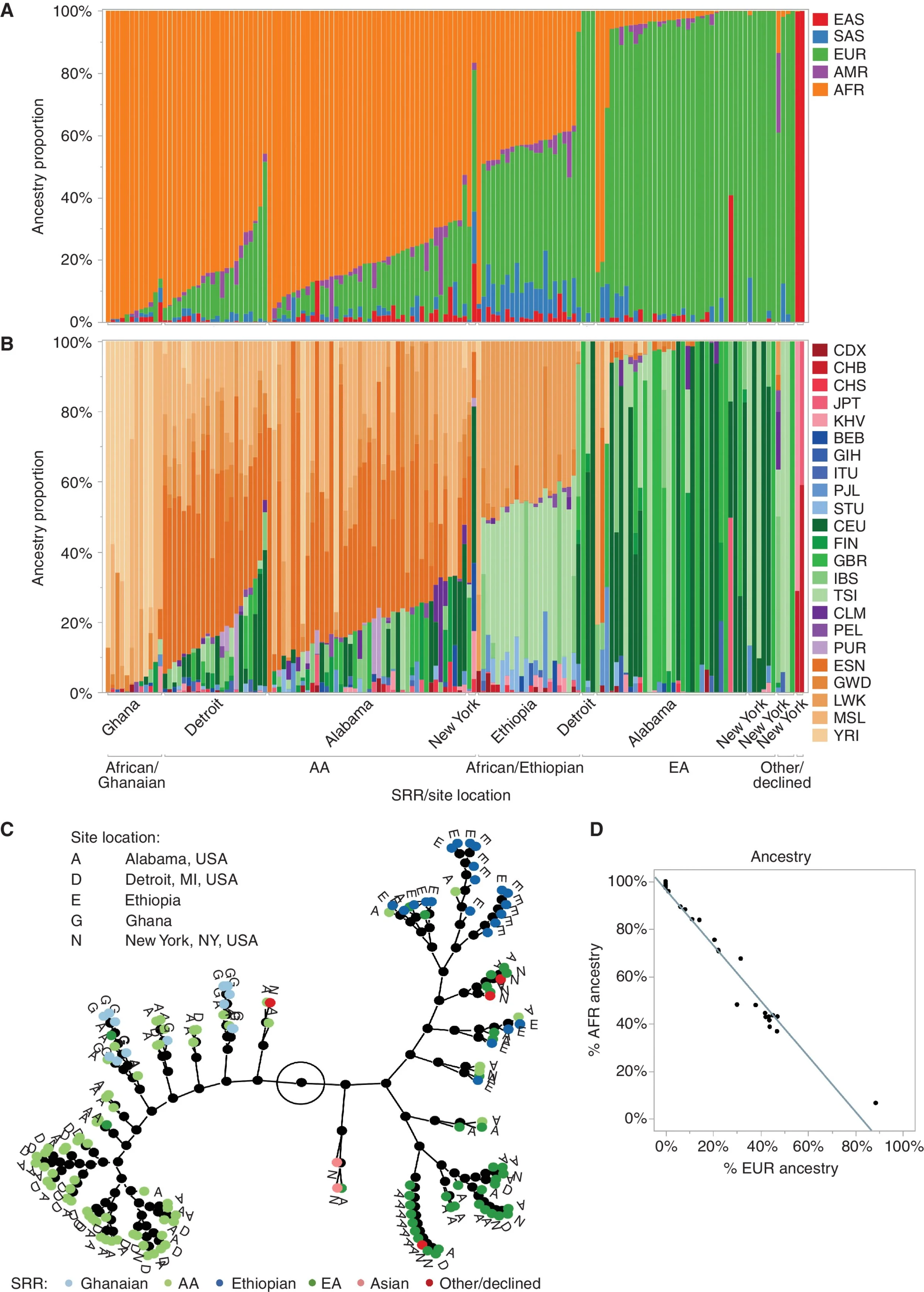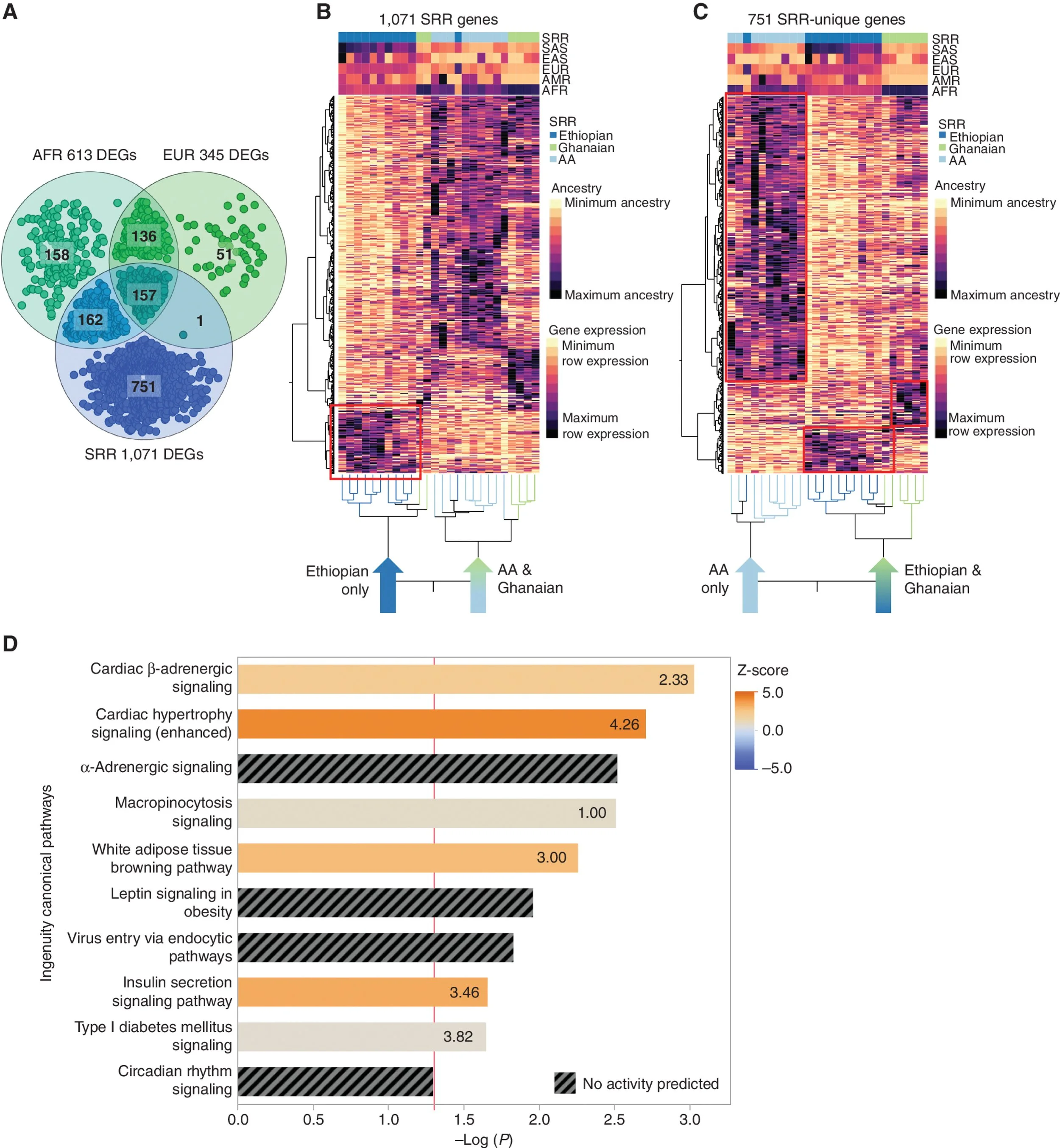 The African cluster separated into two subnodes, but the divergence was largely driven by an upregulated gene signature found among AA and not seen among our African patients. We hypothesized that this signature represents distinct environmental influences that are unique to AA patients. Strikingly, signature pathway analyses determined that several known canonical pathways were enriched in AAs compared with Ghanaians and Ethiopians (P < 0.05), including several related to comorbidities that may reflect unknown comorbidity health status in our patient cohort.